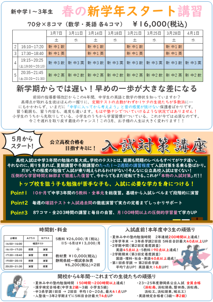 新中学1年生 3/7(土)・3/14(土)・3/21(土)・3/28(土)
